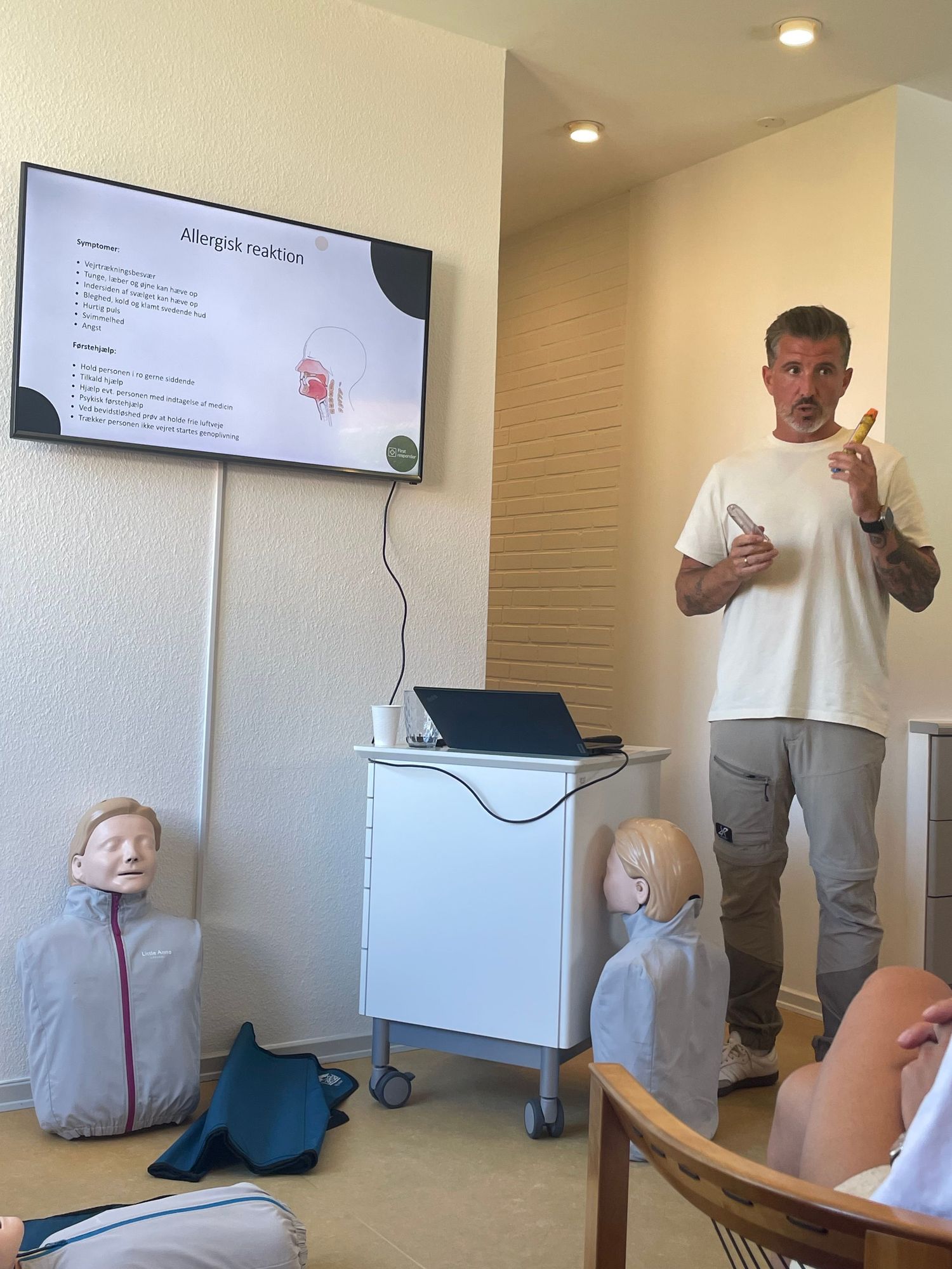 Kurset blev afholdt af Tim fra Firstresponder.dk. Han kan varmt anbefaldes hvis man har brug for et førstehjælpskursus. Han er rigtig god til at gøre det spændende, og det var en god måde han afholdt kurset på med vekslen mellem teori og praktiske øvelser.